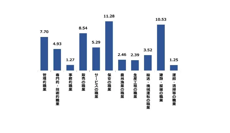 岐阜県の11月の職種別有効求人倍率は、保安の職業が11.28倍、建設・採掘の職業が10.53倍と高くなっております。