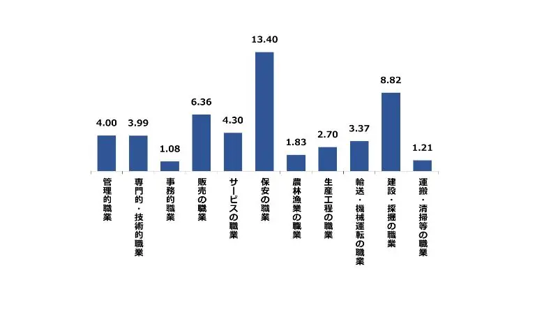 岐阜県の9月の職種別有効求人倍率は、保安の職業が13.40倍、建設・採掘の職業が8.82倍と高くなっております。