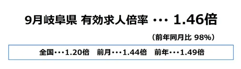 岐阜県の9月の有効求人倍率は、1.46倍となり、前月より0.02ポイント上昇、前年同月比では98%となっております。