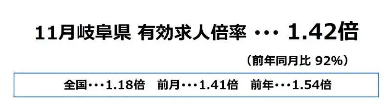 岐阜県の11月の有効求人倍率は、1.42倍となり、前月より0.01ポイント上昇、前年同月比では92%となっております。
