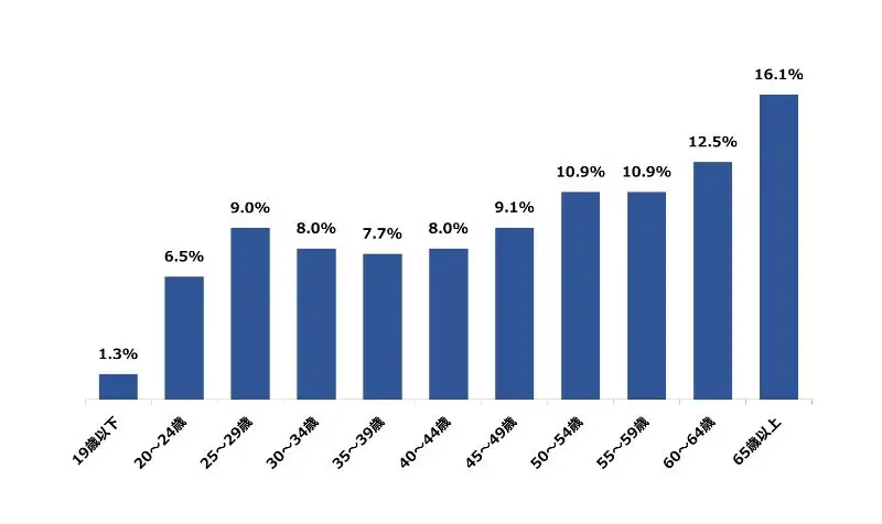 岐阜県の9月の年齢別階級月間有効求職者数(構成比)は、65歳以上が最も高く16.1%、次いで60~64歳が12.5%となっております。