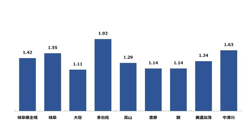岐阜県の11月の地域別有効求人倍率は、多治見が最も高く1.93倍、それ以外のすべての地域で1倍を超える有効求人倍率となっております。