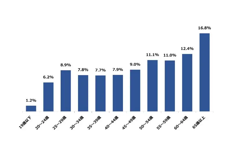 岐阜県の11月の年齢別階級月間有効求職者数(構成比)は、65歳以上が最も高く16.8%、次いで60~64歳が12.4%となっております。