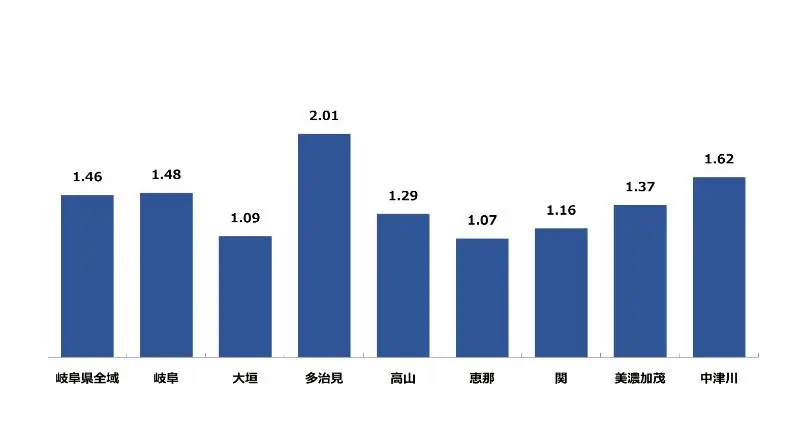 岐阜県の9月の地域別有効求人倍率は、多治見が最も高く2.01倍、それ以外のすべての地域で1倍を超える有効求人倍率となっております。