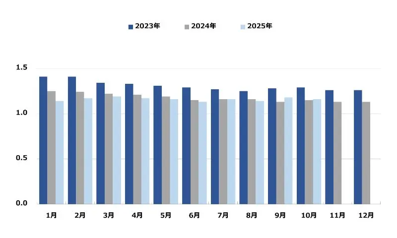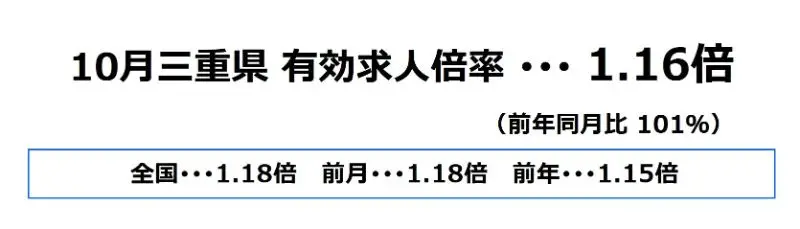 三重県の10月の有効求人倍率は、1.16倍となり、前月より0.02ポイント下降、前年同月比では101%となっております。