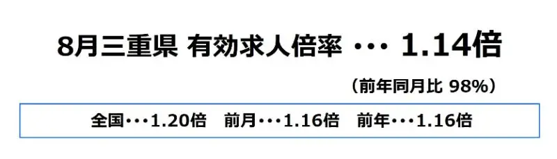 三重県の8月の有効求人倍率は、1.14倍となり、前月より0.02ポイント下降、前年同月比では98%となっております。