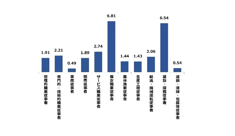 三重県の11月の職種別有効求人倍率は、保安職業従事者が6.81倍、建設・採掘従事者が6.54倍と高くなっております。
