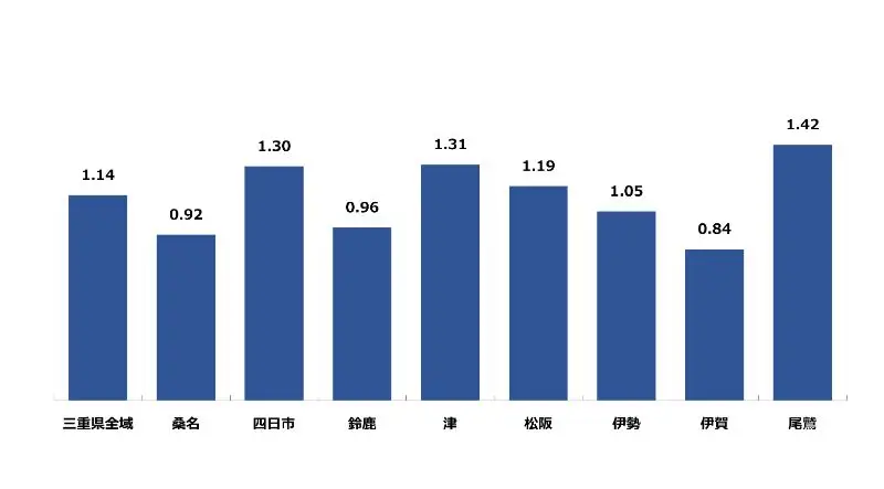 三重県の8月の地域別有効求人倍率は、尾鷲が最も高く1.42倍、それ以外の地域でも半数以上が1倍を超える有効求人倍率となっております。