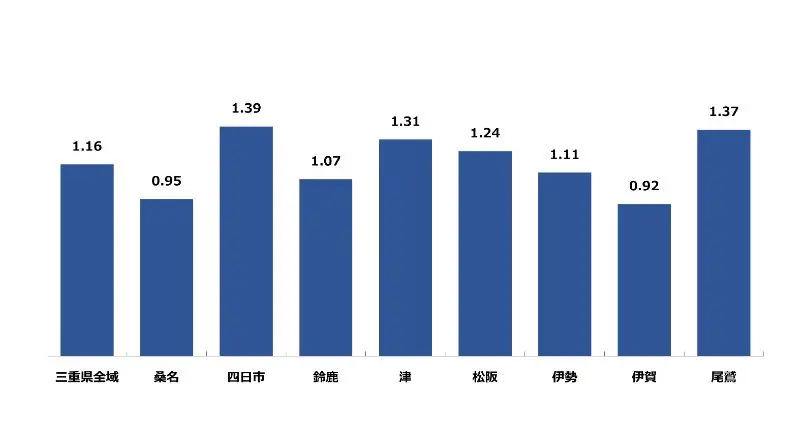 三重県の10月の地域別有効求人倍率は、四日市が最も高く1.39倍、それ以外の地域でも半数以上が1倍を超える有効求人倍率となっております。