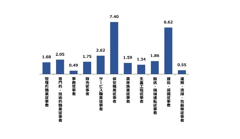 三重県の10月の職種別有効求人倍率は、保安職業従事者が7.40倍、建設・採掘従事者が6.62倍と高くなっております。