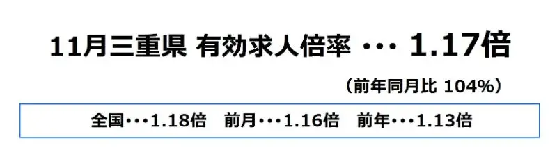 三重県の11月の有効求人倍率は、1.17倍となり、前月より0.01ポイント上昇、前年同月比では104%となっております。