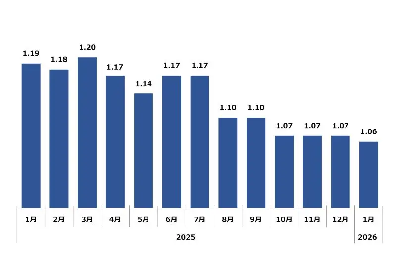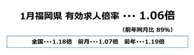 福岡県の1月の有効求人倍率は、1.06倍となり、前月より0.01ポイント下降、前年同月比では89%となっております。