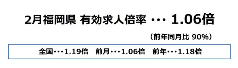 福岡県の2月の有効求人倍率は、1.06倍となり、前月と同水準、前年同月比では90%となっております。
