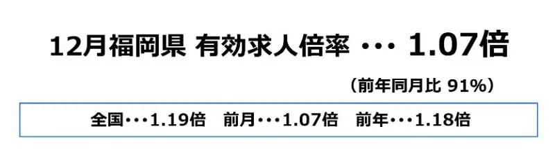 福岡県の12月の有効求人倍率は、1.07倍となり、前月と同水準、前年同月比では91%となっております。