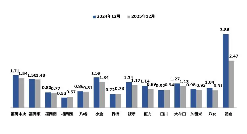 福岡県の12月の地域別有効求人倍率は、朝倉が最も高く2.47倍、次いで福岡中央が1.54倍と高くなっております。