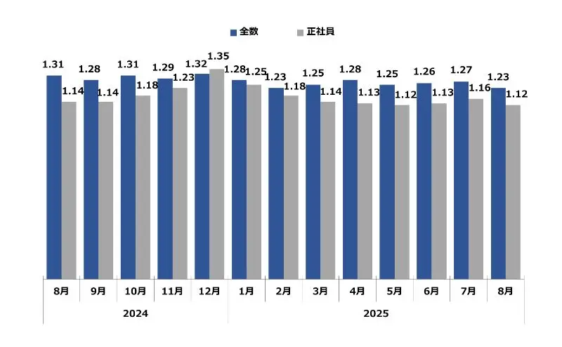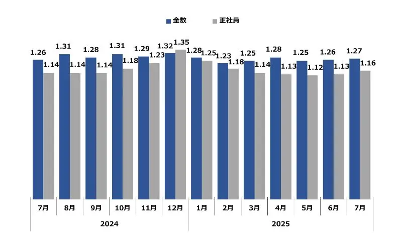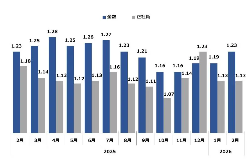 求職者1人に対する求人件数。倍率が1を超えるということは、求職者数よりも求人件数が多い(=採用難)ということを表します。