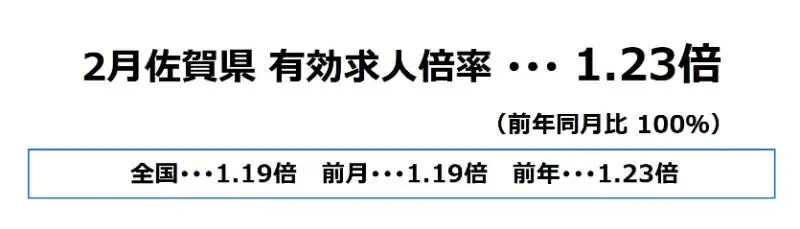 佐賀県の2月の有効求人倍率は、1.23倍となり、前月より0.04ポイント上昇、前年同月比では100%となっております。