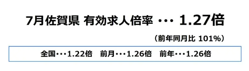 佐賀県の7月の有効求人倍率は、1.27倍となり、前月より0.01ポイント上昇、前年同月比では101%となっております。