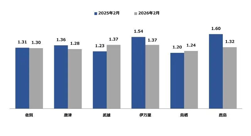 佐賀県の2月の地域別有効求人倍率は、武雄・伊万里が最も高く1.37倍、それ以外の地域でも1倍を超える有効求人倍率となっております。
