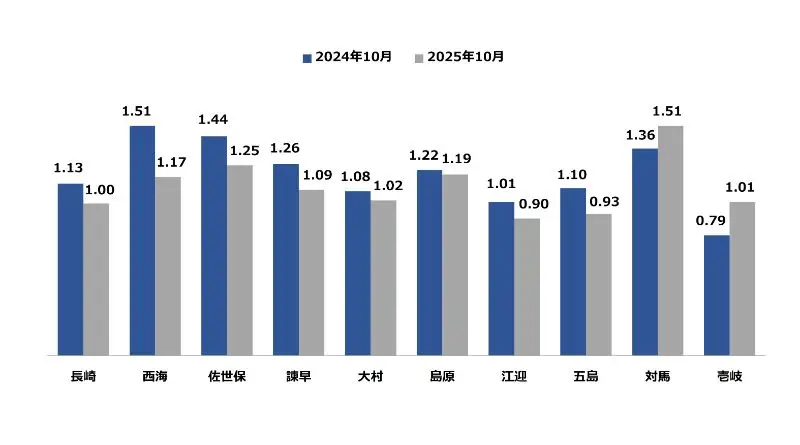 2025年12月現在、長崎労働局からリリースされている2025年10月度の有効求人倍率データをまとめました。