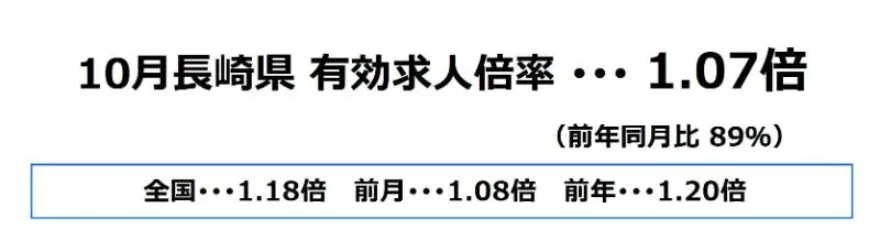 長崎県の10月の有効求人倍率は、1.07倍となり、前月より0.01ポイント下降、前年同月比では89%となっております。