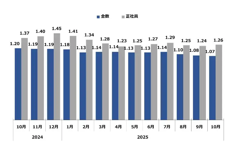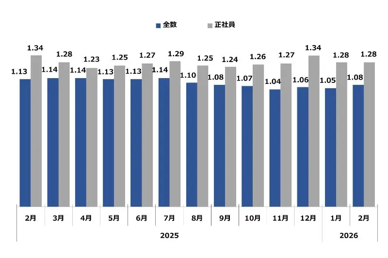 求職者1人に対する求人件数。倍率が1を超えるということは、求職者数よりも求人件数が多い(=採用難)ということを表します。