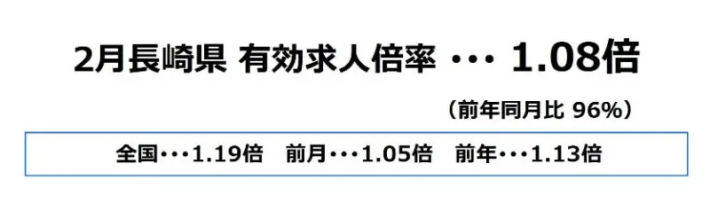 長崎県の2月の有効求人倍率は、1.08倍となり、前月より0.03ポイント上昇、前年同月比では96%となっております。