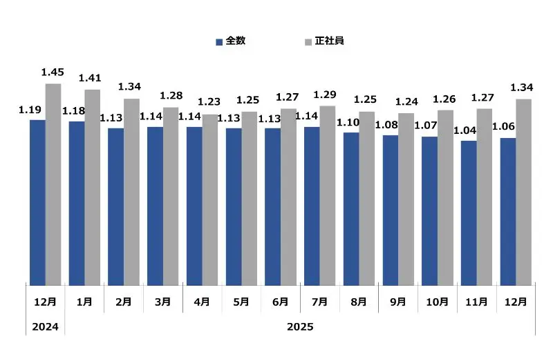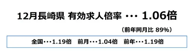 長崎県の12月の有効求人倍率は、1.06倍となり、前月より0.02ポイント上昇、前年同月比では89%となっております。