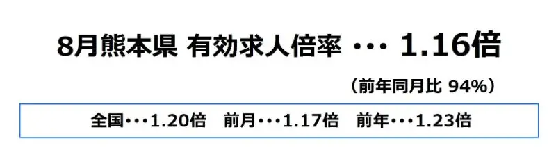 熊本県の8月の有効求人倍率は、1.16倍となり、前月より0.01ポイント下降、前年同月比では94%となっております。