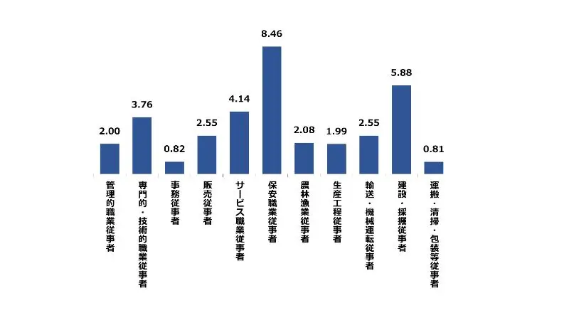熊本県の8月の職種別有効求人倍率は、保安職業従事者が8.46倍、建設・採掘従事者が5.88倍と高くなっております。