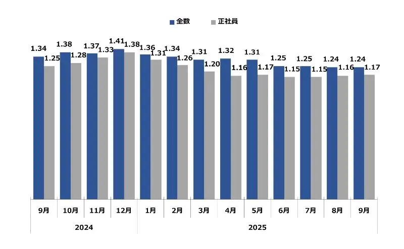 求職者1人に対する求人件数。倍率が1を超えるということは、求職者数よりも求人件数が多い(=採用難)ということを表します。