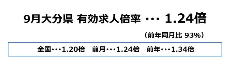 大分県の9月の有効求人倍率は、1.24倍となり、前月と同水準、前年同月比では93%となっております。