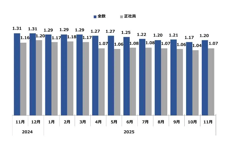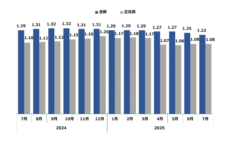 求職者1人に対する求人件数。倍率が1を超えるということは、求職者数よりも求人件数が多い(=採用難)ということを表します