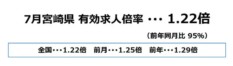 宮崎県の7月の有効求人倍率は、1.22倍となり、前月より0.03ポイント下降、前年同月比では95%となっております。