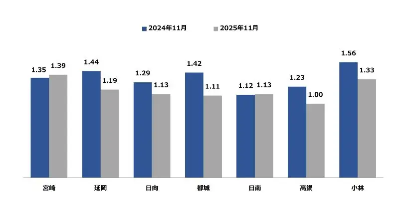 宮崎県の11月の地域別有効求人倍率は、宮崎が最も高く1.39倍、次いで小林が1.33倍となっております。