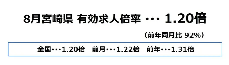 宮崎県の8月の有効求人倍率は、1.20倍となり、前月より0.02ポイント下降、前年同月比では92%となっております。