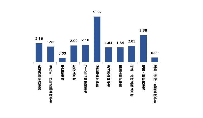 宮崎県の8月の職種別有効求人倍率は、保安職業従事者が5.66倍、建設・採掘従事者が3.38倍と高くなっております。