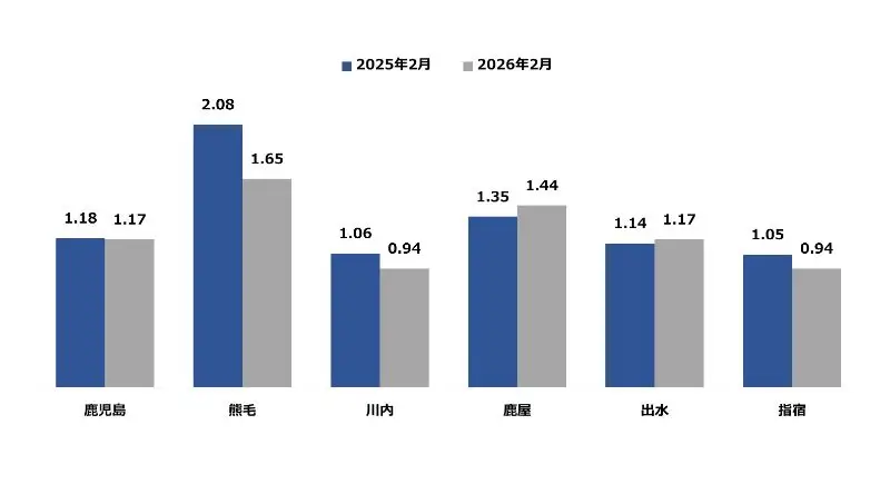 鹿児島県の2月の地域別有効求人倍率は、熊毛が最も高く1.65倍、次いで鹿屋が1.44倍となっております。