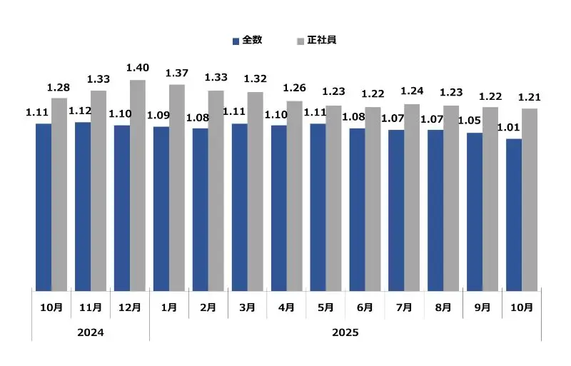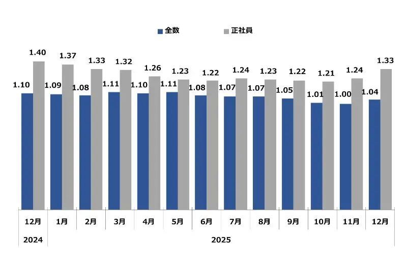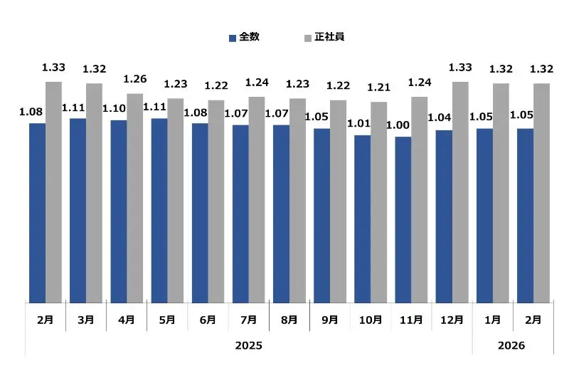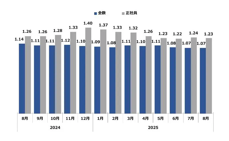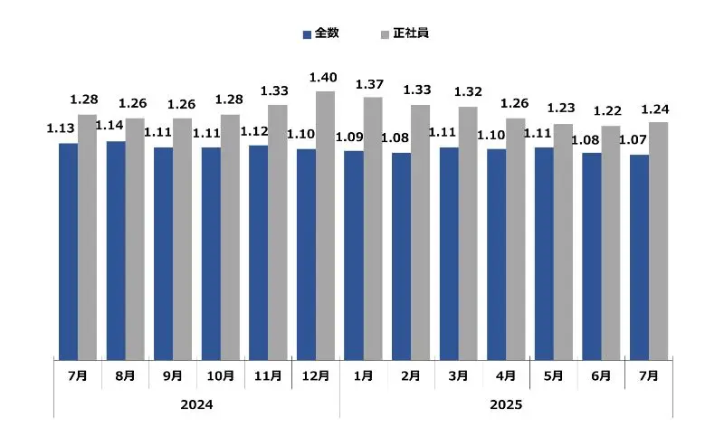 求職者1人に対する求人件数。倍率が1を超えるということは、求職者数よりも求人件数が多い(=採用難)ということを表します