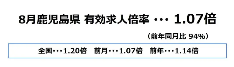 鹿児島県の8月の有効求人倍率は、1.07倍となり、前月と同水準、前年同月比では94%となっております。