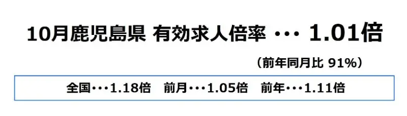 鹿児島県の10月の有効求人倍率は、1.01倍となり、前月より0.04ポイント下降、前年同月比では91%となっております。