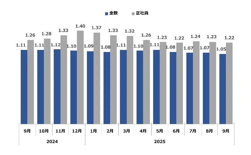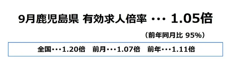鹿児島県の9月の有効求人倍率は、1.05倍となり、前月より0.02ポイント下降、前年同月比では95%となっております。