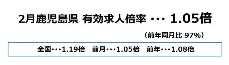 鹿児島県の2月の有効求人倍率は、1.05倍となり、前月と同水準、前年同月比では97%となっております。