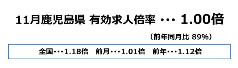 鹿児島県の11月の有効求人倍率は、1.00倍となり、前月より0.01ポイント下降、前年同月比では89%となっております。