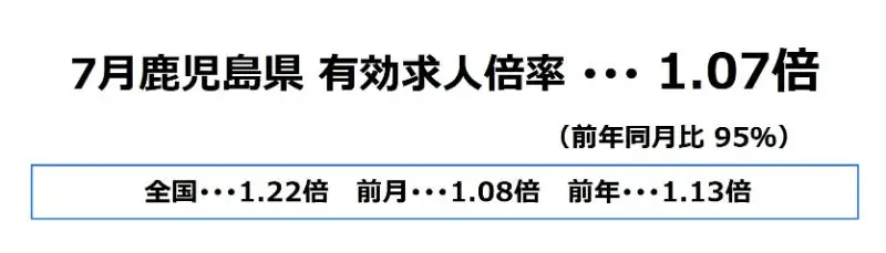 鹿児島県の7月の有効求人倍率は、1.07倍となり、前月より0.01ポイント下降、前年同月比では95%となっております。