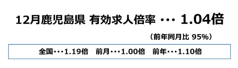 鹿児島県の12月の有効求人倍率は、1.04倍となり、前月より0.04ポイント上昇、前年同月比では95%となっております。