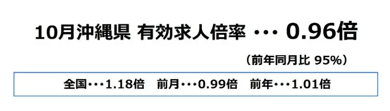 沖縄県の10月の有効求人倍率は、0.96倍となり、前月より0.03ポイント下降、前年同月比では95%となっております。