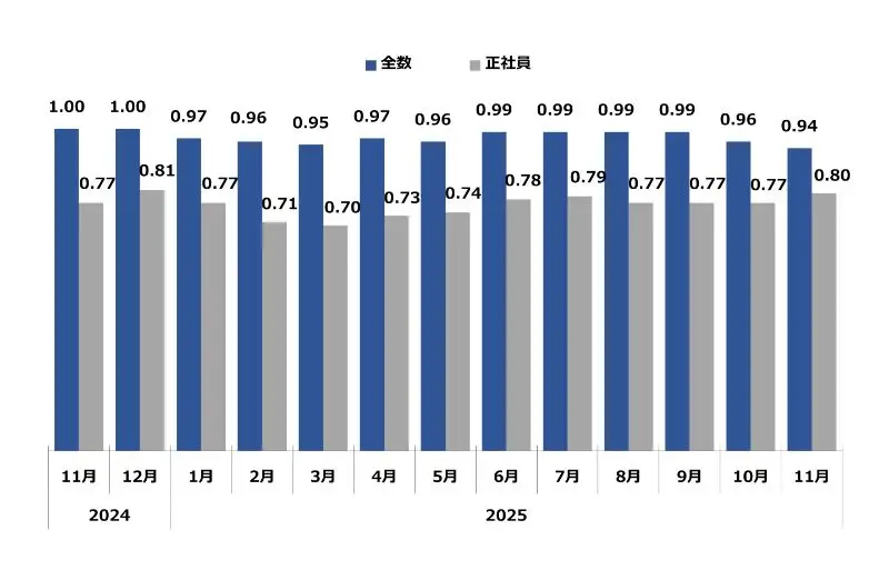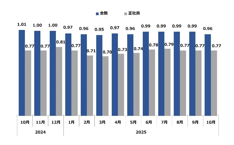求職者1人に対する求人件数。倍率が1を超えるということは、求職者数よりも求人件数が多い(=採用難)ということを表します。