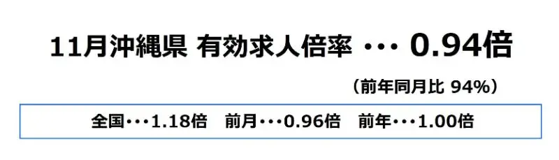 沖縄県の11月の有効求人倍率は、0.94倍となり、前月より0.02ポイント下降、前年同月比では94%となっております。