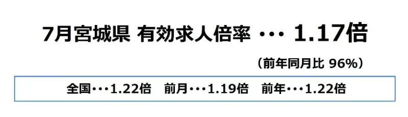 宮城県の7月の有効求人倍率は、1.17倍となり、前月より0.02ポイント下降、前年同月比では96%となっております。